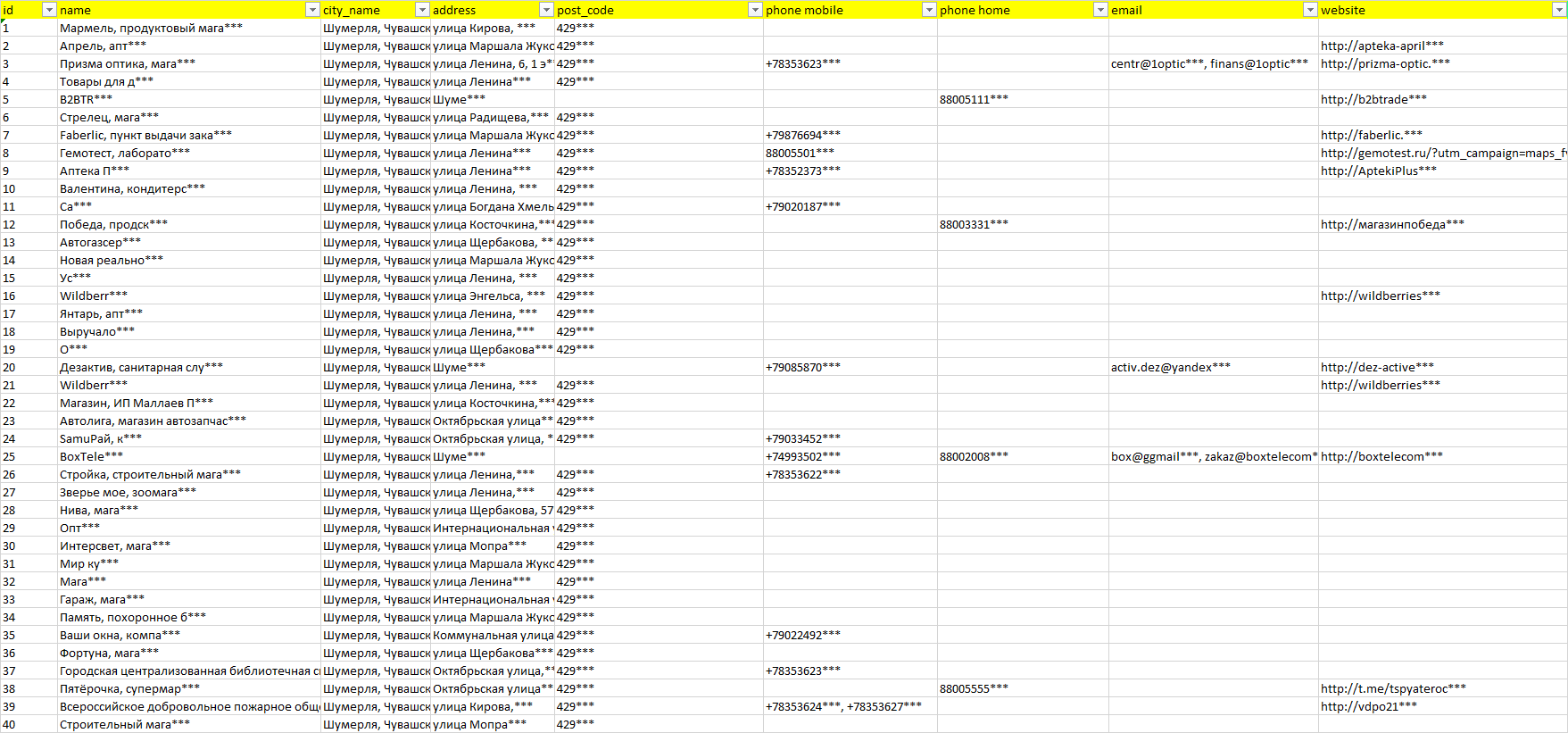 База компаний Шумерля, вся РФ в формате Excel с эл. почтами, телефонами, сайтами, ссылками на соц сети, координатами и другой информацией. Скачайте демо версию, чтобы ознакомиться с данными.