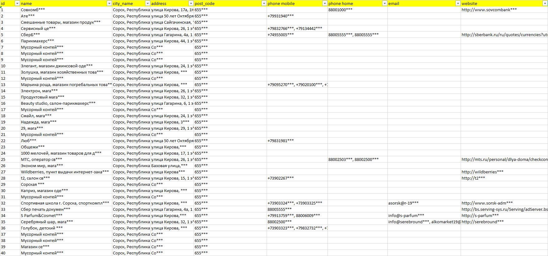 База компаний Сорск, вся РФ в формате Excel с эл. почтами, телефонами, сайтами, ссылками на соц сети, координатами и другой информацией. Скачайте демо версию, чтобы ознакомиться с данными.