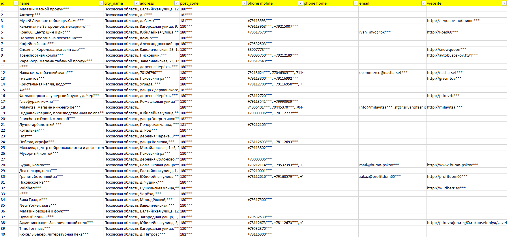 База организаций Псковская область, вся Россия в формате Excel с эл. почтами, телефонами, сайтами, ссылками на соц сети, координатами и другой информацией. Скачайте демо версию, чтобы ознакомиться с данными.