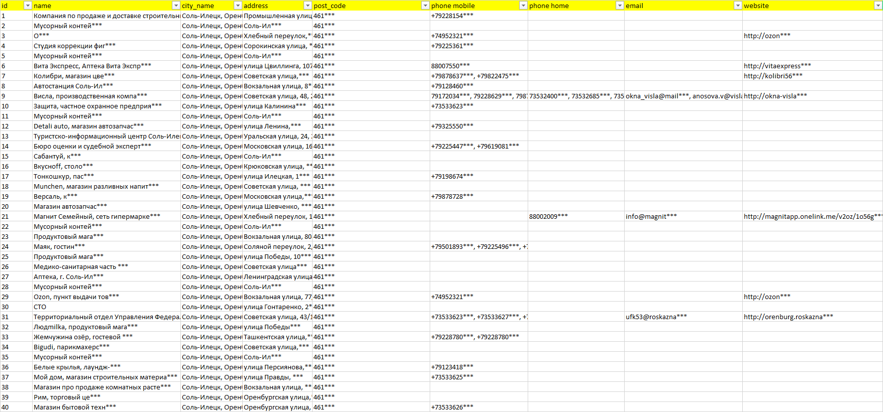 База компаний Соль-Илецк, вся РФ в формате Excel с эл. почтами, телефонами, сайтами, ссылками на соц сети, координатами и другой информацией. Скачайте демо версию, чтобы ознакомиться с данными.