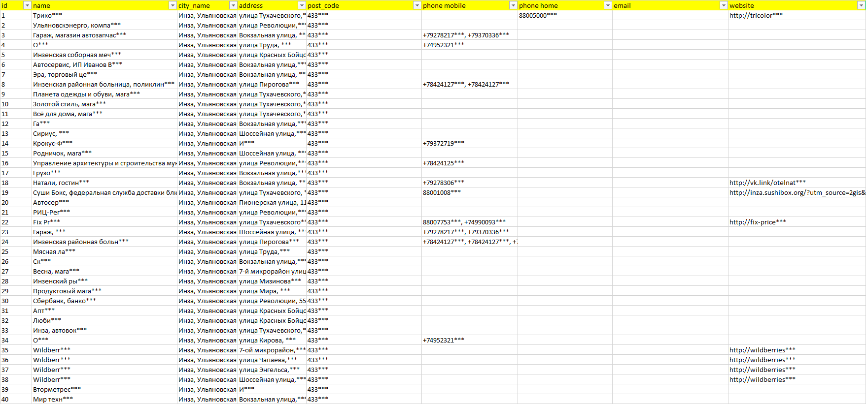 База компаний Инза, вся РФ в формате Excel с эл. почтами, телефонами, сайтами, ссылками на соц сети, координатами и другой информацией. Скачайте демо версию, чтобы ознакомиться с данными.