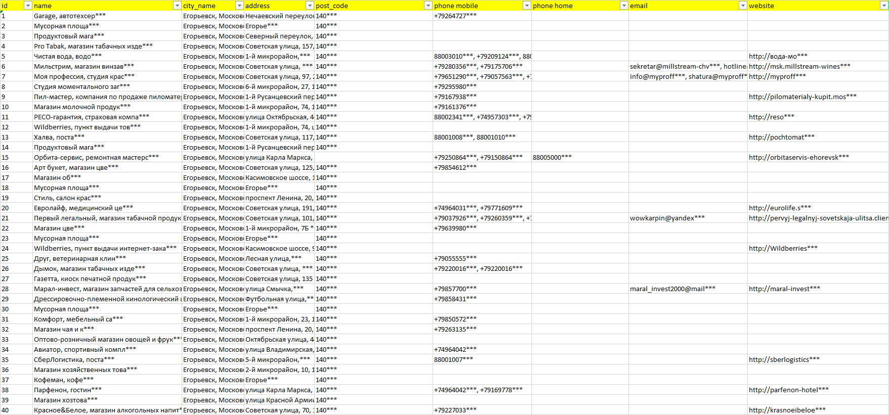 База компаний Егорьевск, вся РФ в формате Excel с эл. почтами, телефонами, сайтами, ссылками на соц сети, координатами и другой информацией. Скачайте демо версию, чтобы ознакомиться с данными.
