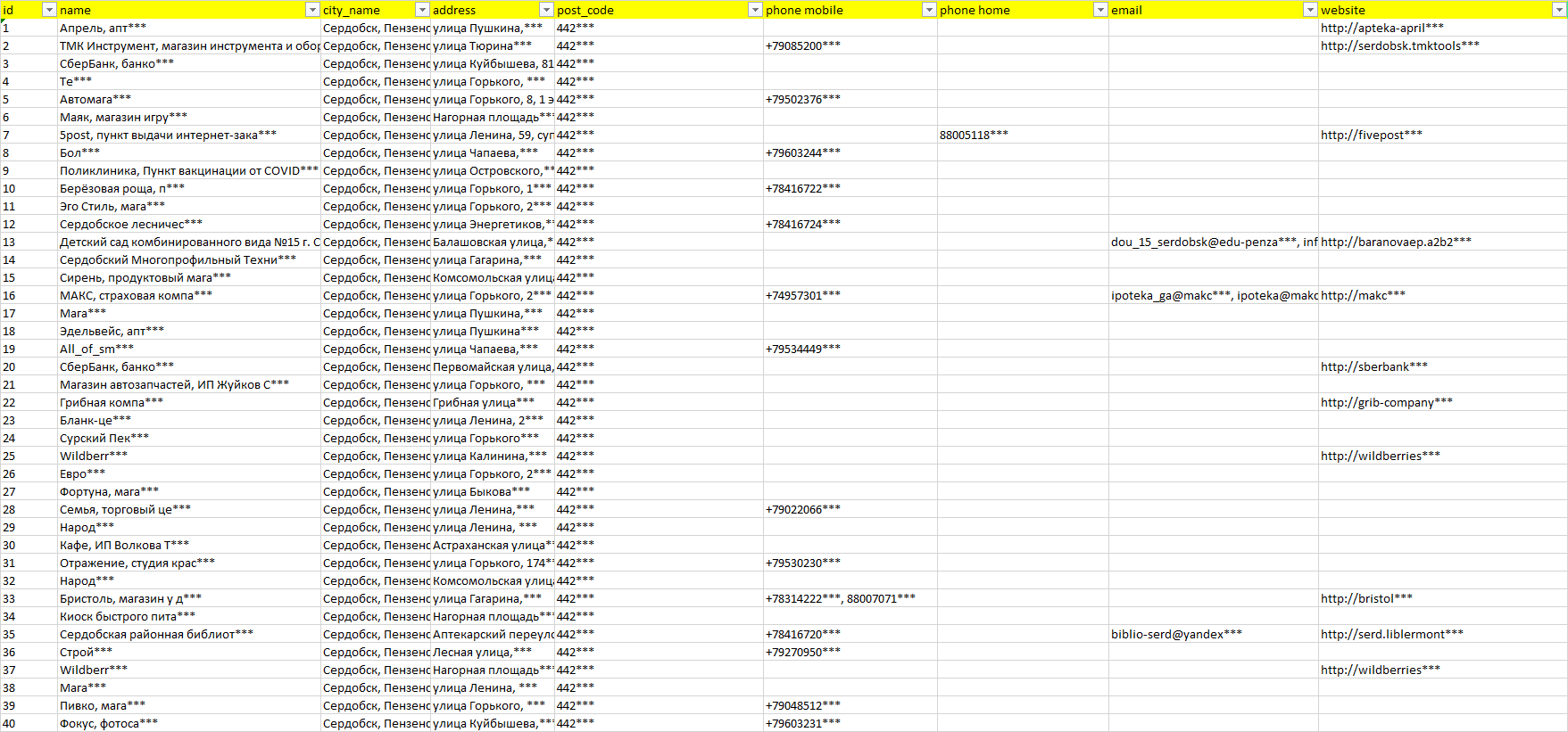 База компаний Сердобск, вся РФ в формате Excel с эл. почтами, телефонами, сайтами, ссылками на соц сети, координатами и другой информацией. Скачайте демо версию, чтобы ознакомиться с данными.