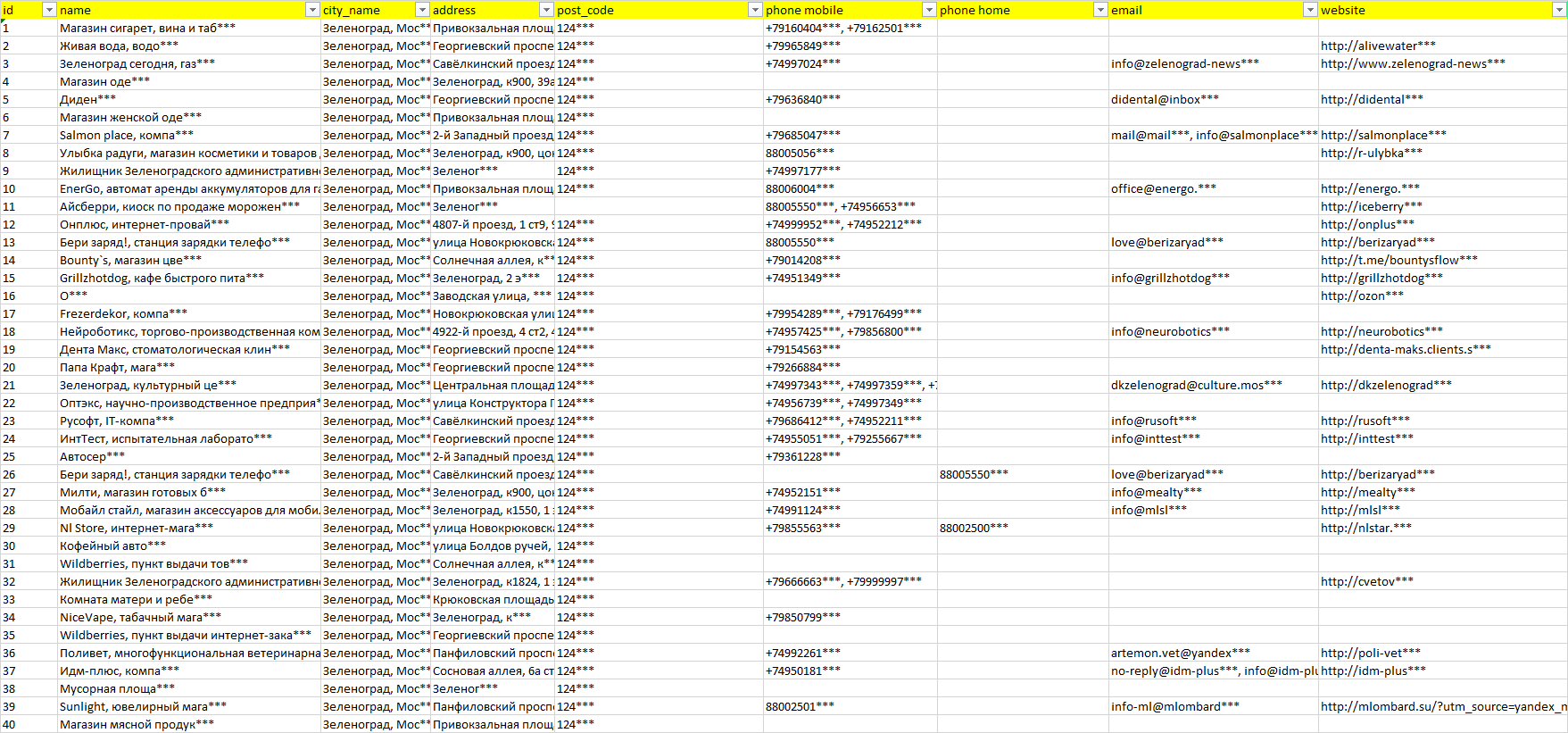 База компаний Зеленоград, вся РФ в формате Excel с эл. почтами, телефонами, сайтами, ссылками на соц сети, координатами и другой информацией. Скачайте демо версию, чтобы ознакомиться с данными.