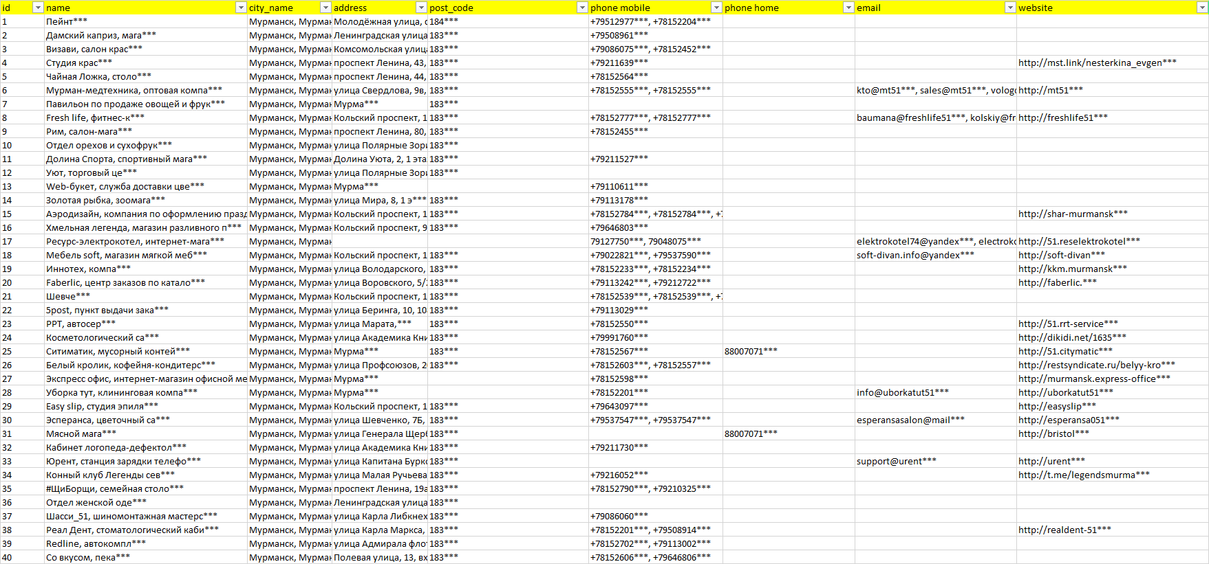 База компаний Мурманск, вся РФ в формате Excel с эл. почтами, телефонами, сайтами, ссылками на соц сети, координатами и другой информацией. Скачайте демо версию, чтобы ознакомиться с данными.