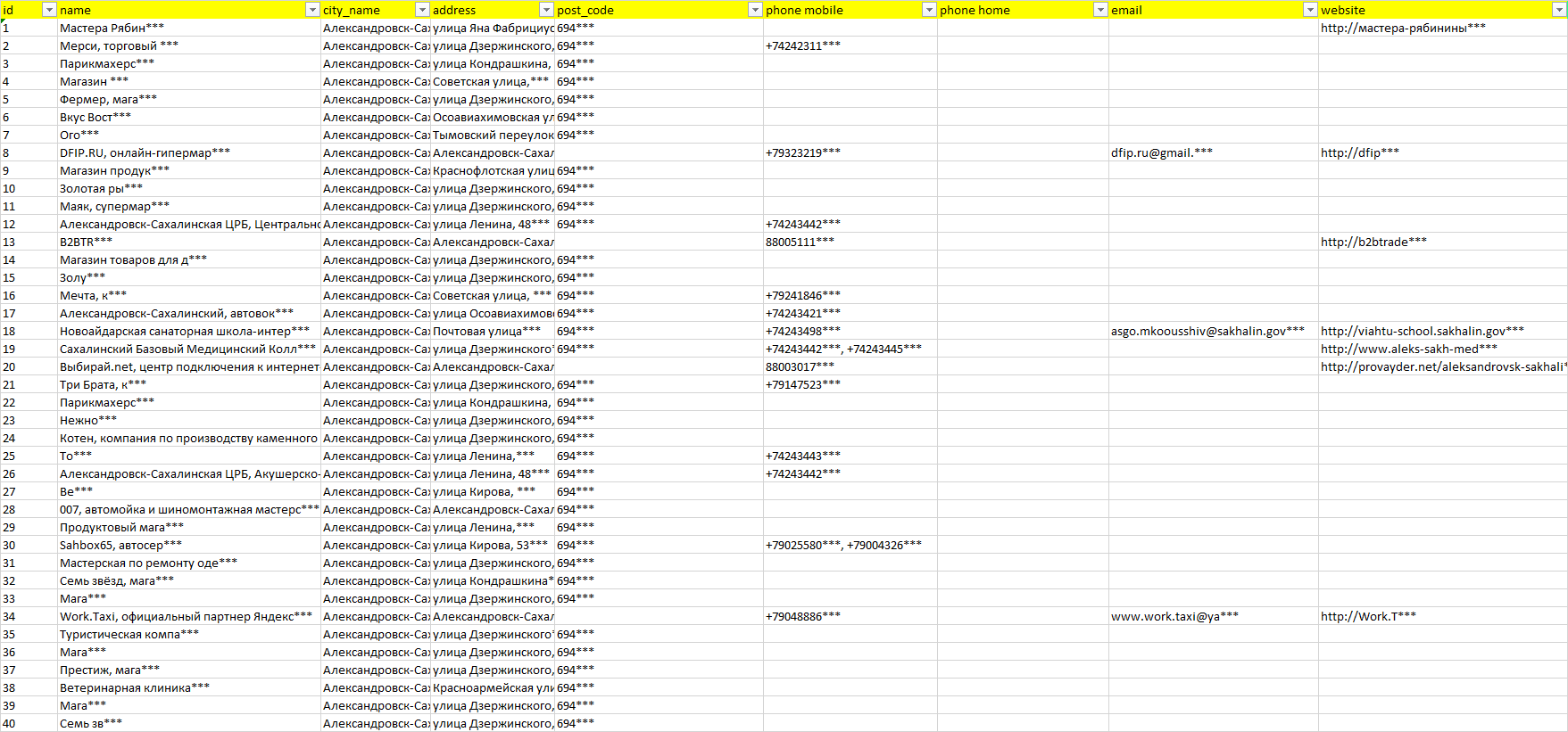 База компаний Александровск-Сахалинский, вся РФ в формате Excel с эл. почтами, телефонами, сайтами, ссылками на соц сети, координатами и другой информацией. Скачайте демо версию, чтобы ознакомиться с данными.