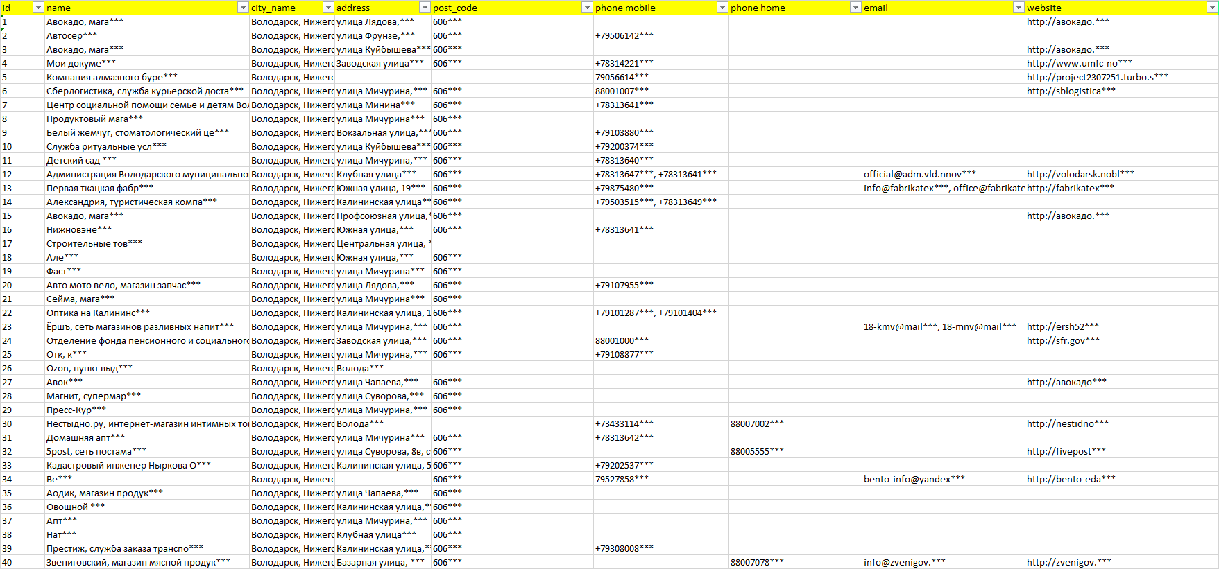 База организаций Володарск, вся Россия в формате Excel с эл. почтами, телефонами, сайтами, ссылками на соц сети, координатами и другой информацией. Скачайте демо версию, чтобы ознакомиться с данными.