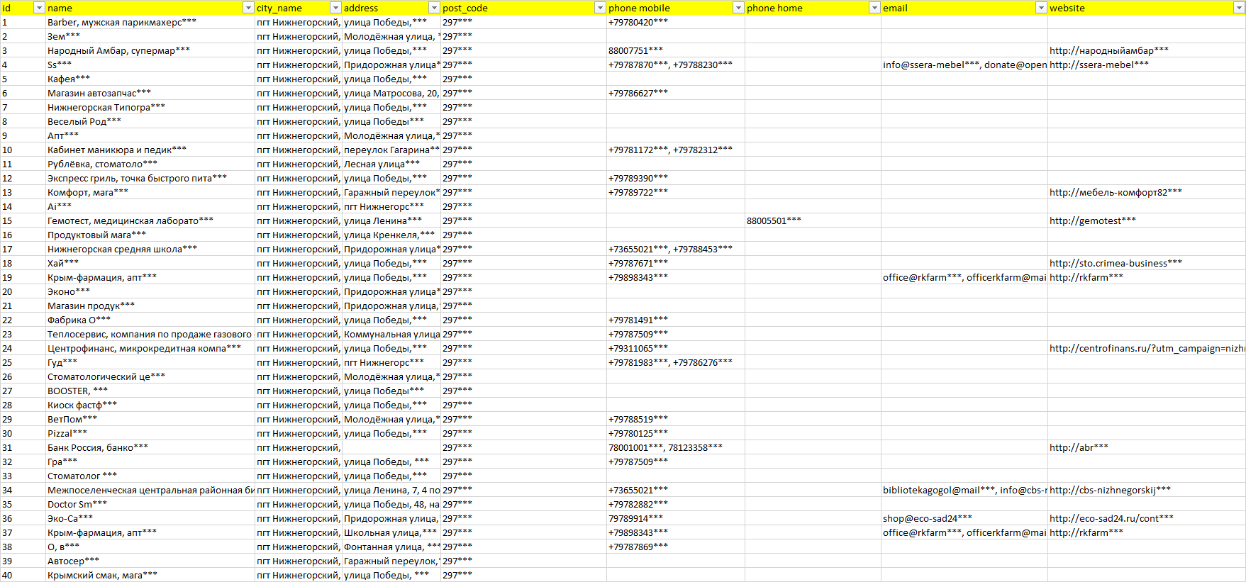 База организаций пгт Нижнегорский, вся Россия в формате Excel с эл. почтами, телефонами, сайтами, ссылками на соц сети, координатами и другой информацией. Скачайте демо версию, чтобы ознакомиться с данными.