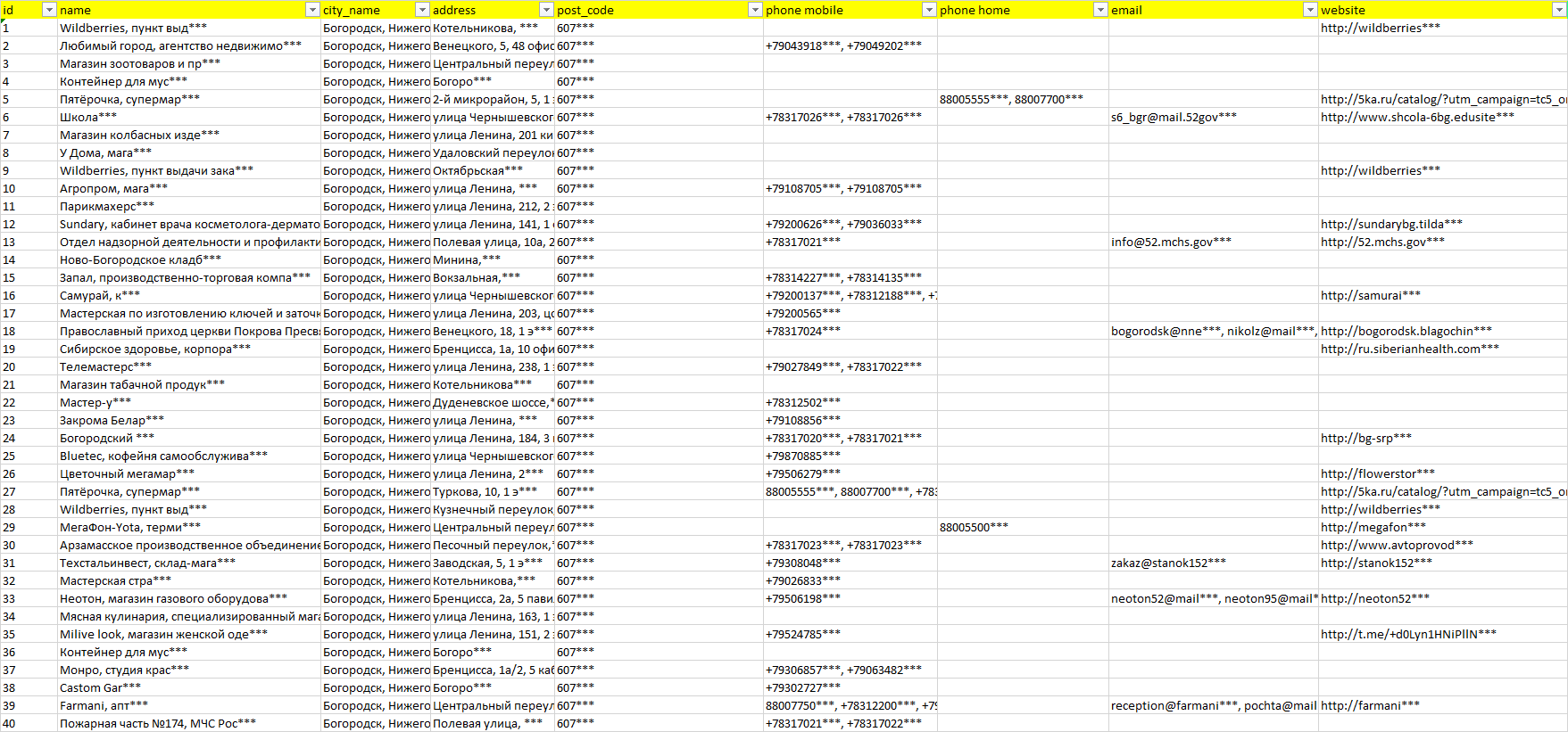 База организаций Богородск, вся Россия в формате Excel с эл. почтами, телефонами, сайтами, ссылками на соц сети, координатами и другой информацией. Скачайте демо версию, чтобы ознакомиться с данными.