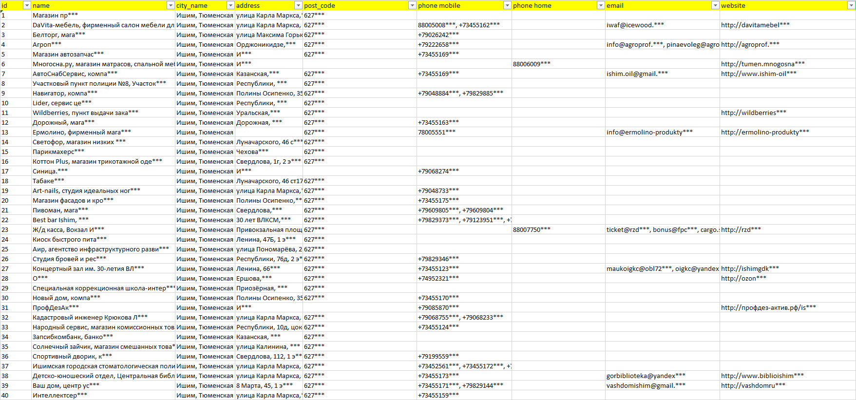 База компаний Ишим, вся РФ в формате Excel с эл. почтами, телефонами, сайтами, ссылками на соц сети, координатами и другой информацией. Скачайте демо версию, чтобы ознакомиться с данными.