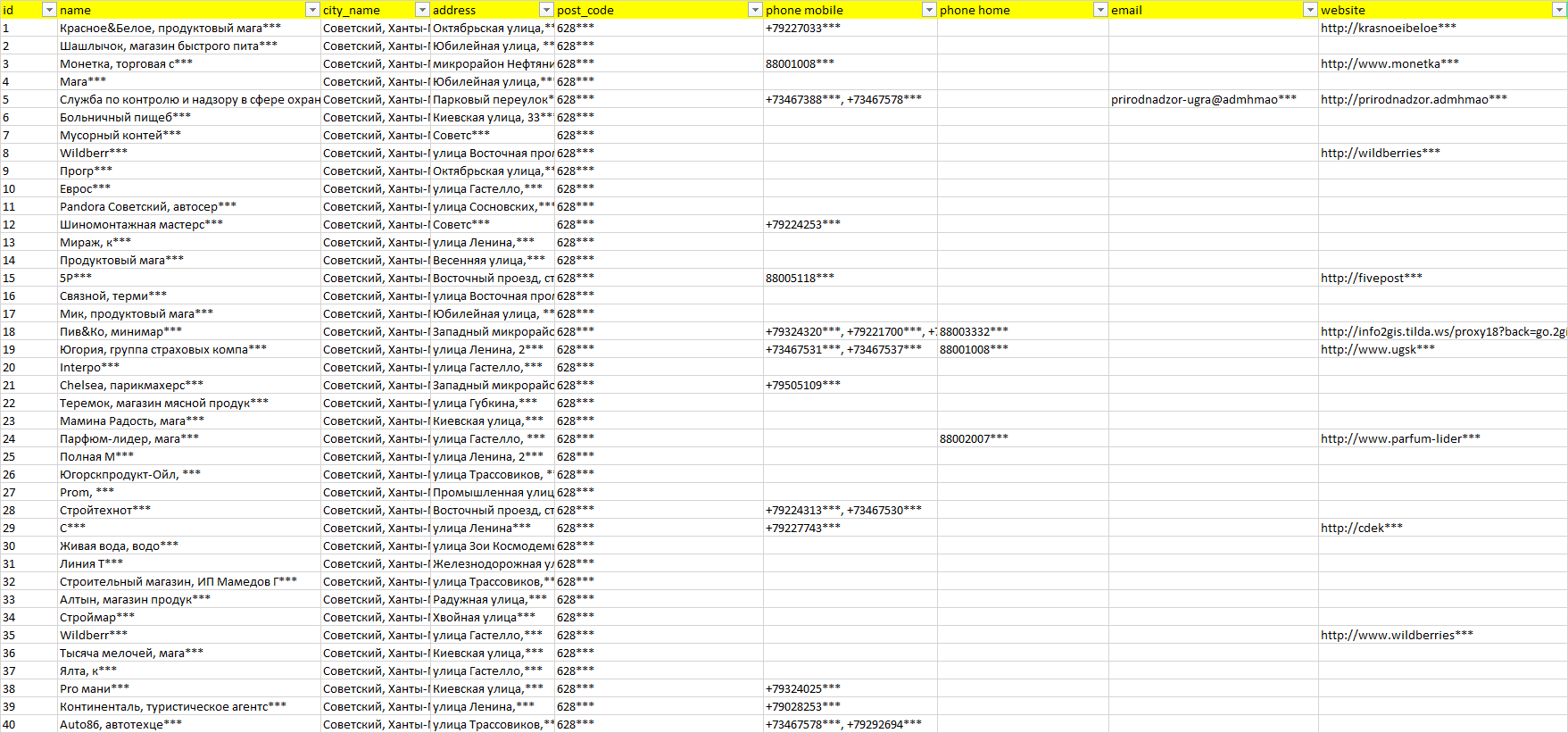 База организаций Советский, вся Россия в формате Excel с эл. почтами, телефонами, сайтами, ссылками на соц сети, координатами и другой информацией. Скачайте демо версию, чтобы ознакомиться с данными.