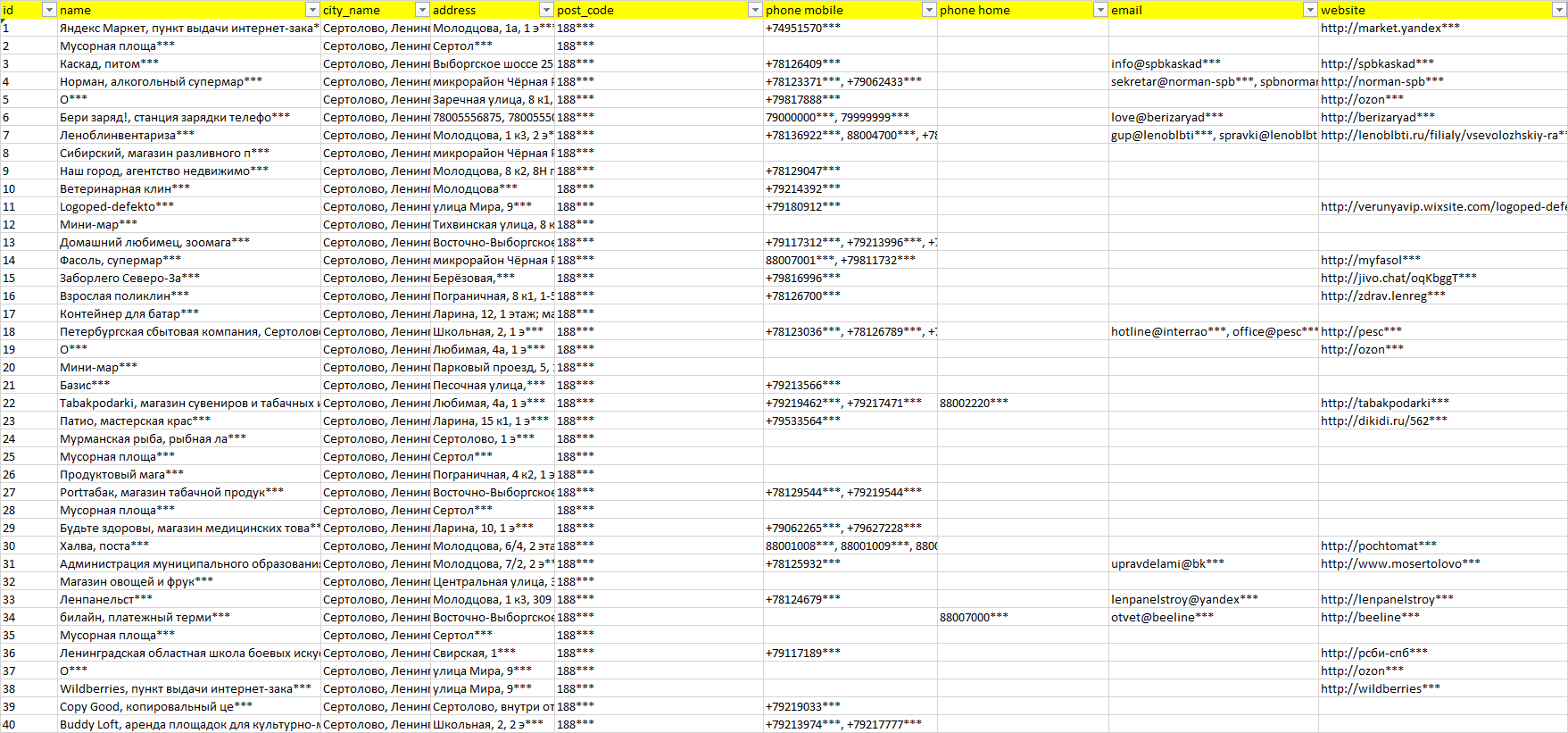 База компаний Сертолово, вся РФ в формате Excel с эл. почтами, телефонами, сайтами, ссылками на соц сети, координатами и другой информацией. Скачайте демо версию, чтобы ознакомиться с данными.