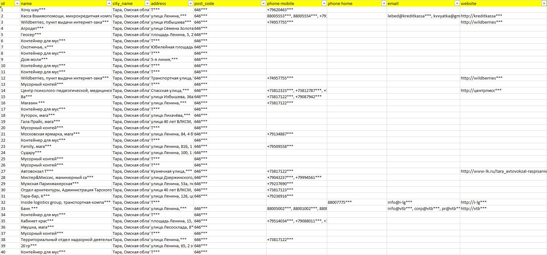 База компаний Тара, вся РФ в формате Excel с эл. почтами, телефонами, сайтами, ссылками на соц сети, координатами и другой информацией. Скачайте демо версию, чтобы ознакомиться с данными.