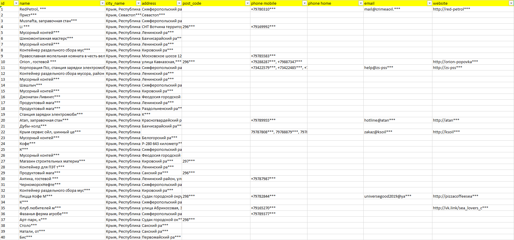 База компаний Крым, вся РФ в формате Excel с эл. почтами, телефонами, сайтами, ссылками на соц сети, координатами и другой информацией. Скачайте демо версию, чтобы ознакомиться с данными.