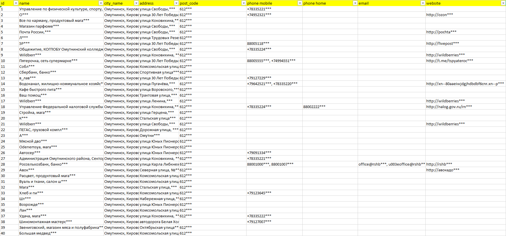 База компаний Омутнинск, вся РФ в формате Excel с эл. почтами, телефонами, сайтами, ссылками на соц сети, координатами и другой информацией. Скачайте демо версию, чтобы ознакомиться с данными.