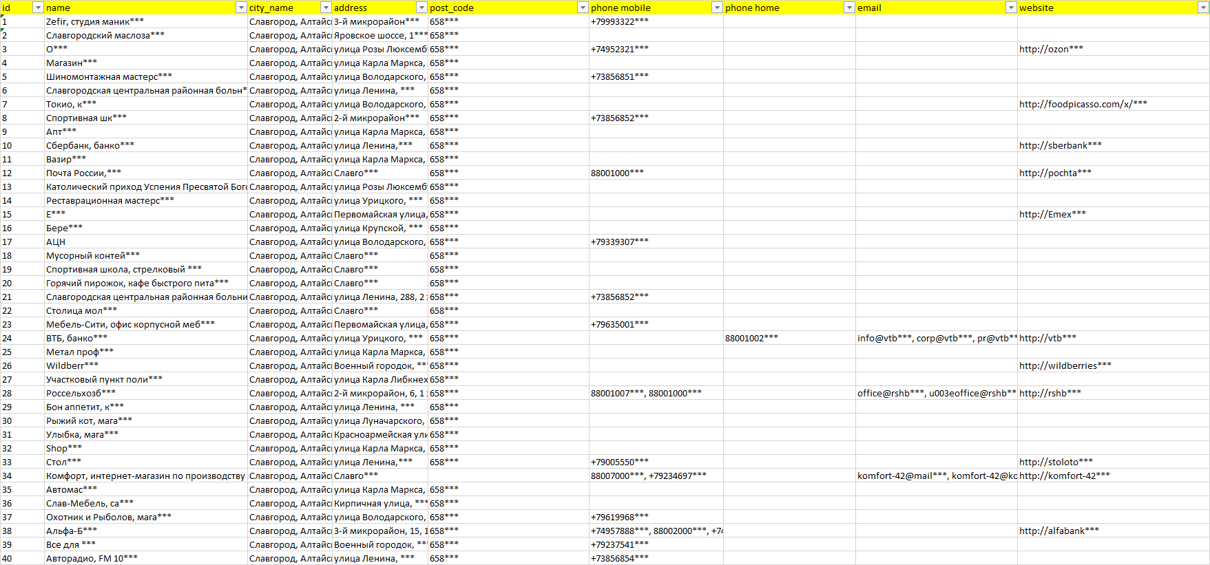 База организаций Славгород, вся Россия в формате Excel с эл. почтами, телефонами, сайтами, ссылками на соц сети, координатами и другой информацией. Скачайте демо версию, чтобы ознакомиться с данными.