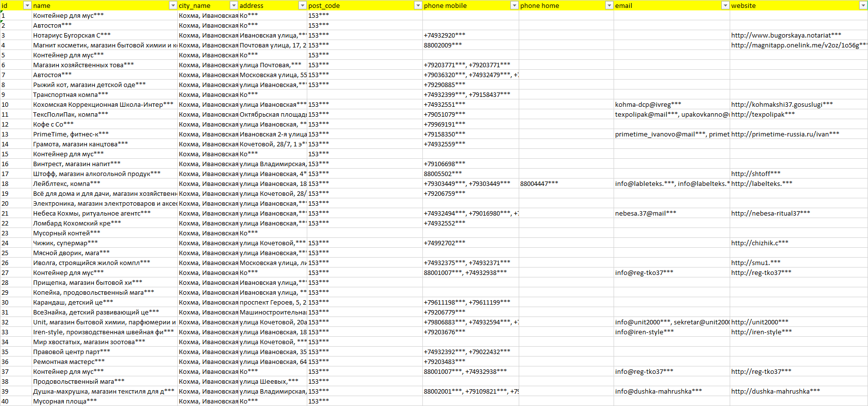 База компаний Кохма, вся РФ в формате Excel с эл. почтами, телефонами, сайтами, ссылками на соц сети, координатами и другой информацией. Скачайте демо версию, чтобы ознакомиться с данными.