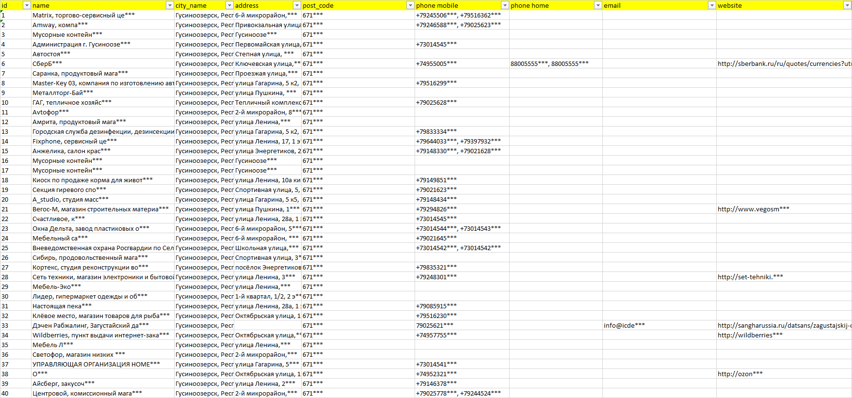 База организаций Гусиноозерск, вся Россия в формате Excel с эл. почтами, телефонами, сайтами, ссылками на соц сети, координатами и другой информацией. Скачайте демо версию, чтобы ознакомиться с данными.
