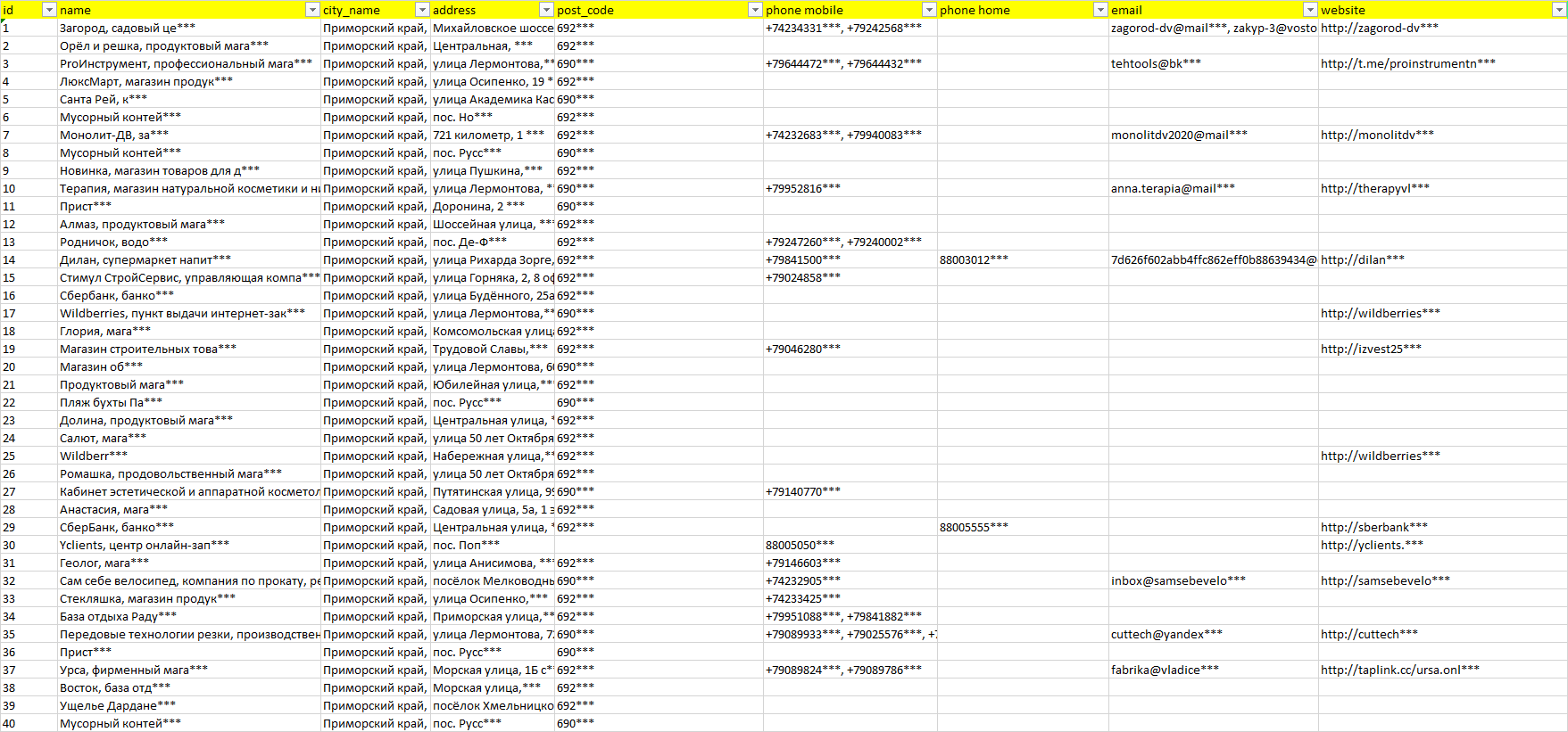 База компаний Приморский край, вся РФ в формате Excel с эл. почтами, телефонами, сайтами, ссылками на соц сети, координатами и другой информацией. Скачайте демо версию, чтобы ознакомиться с данными.
