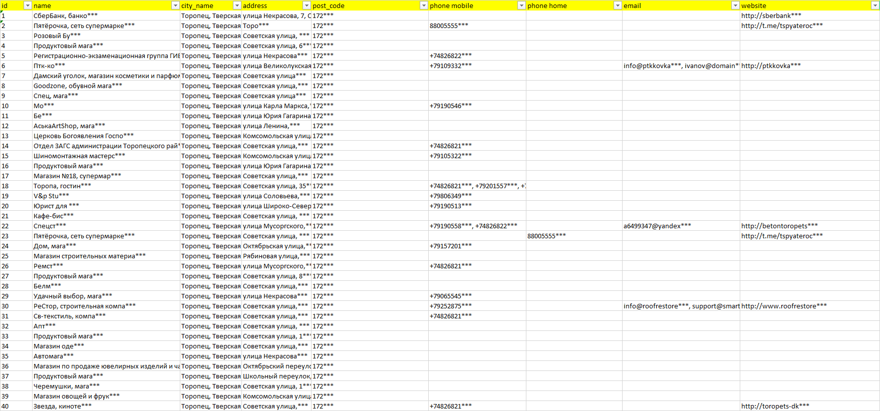 База компаний Торопец, вся РФ в формате Excel с эл. почтами, телефонами, сайтами, ссылками на соц сети, координатами и другой информацией. Скачайте демо версию, чтобы ознакомиться с данными.