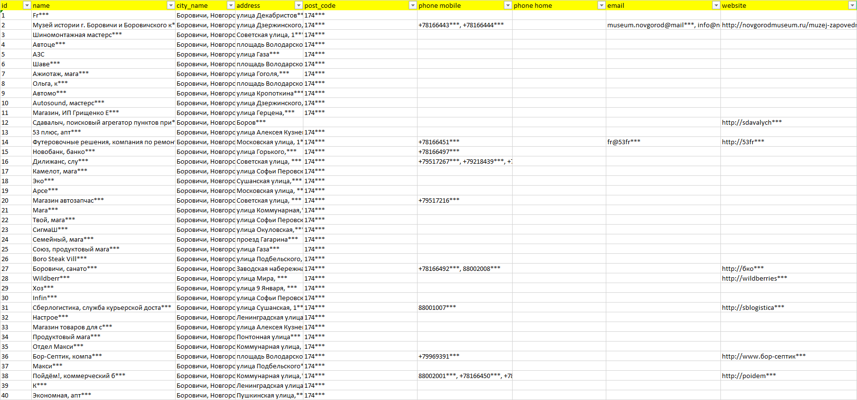 База компаний Боровичи, вся РФ в формате Excel с эл. почтами, телефонами, сайтами, ссылками на соц сети, координатами и другой информацией. Скачайте демо версию, чтобы ознакомиться с данными.