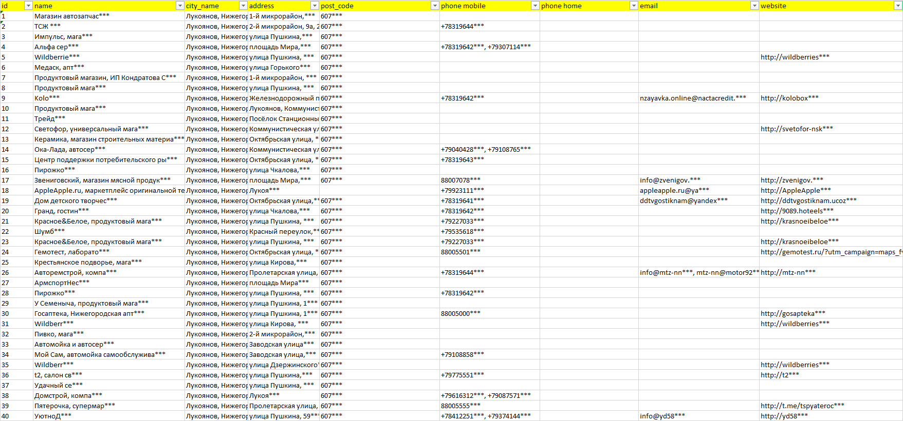 База компаний Лукоянов, вся РФ в формате Excel с эл. почтами, телефонами, сайтами, ссылками на соц сети, координатами и другой информацией. Скачайте демо версию, чтобы ознакомиться с данными.