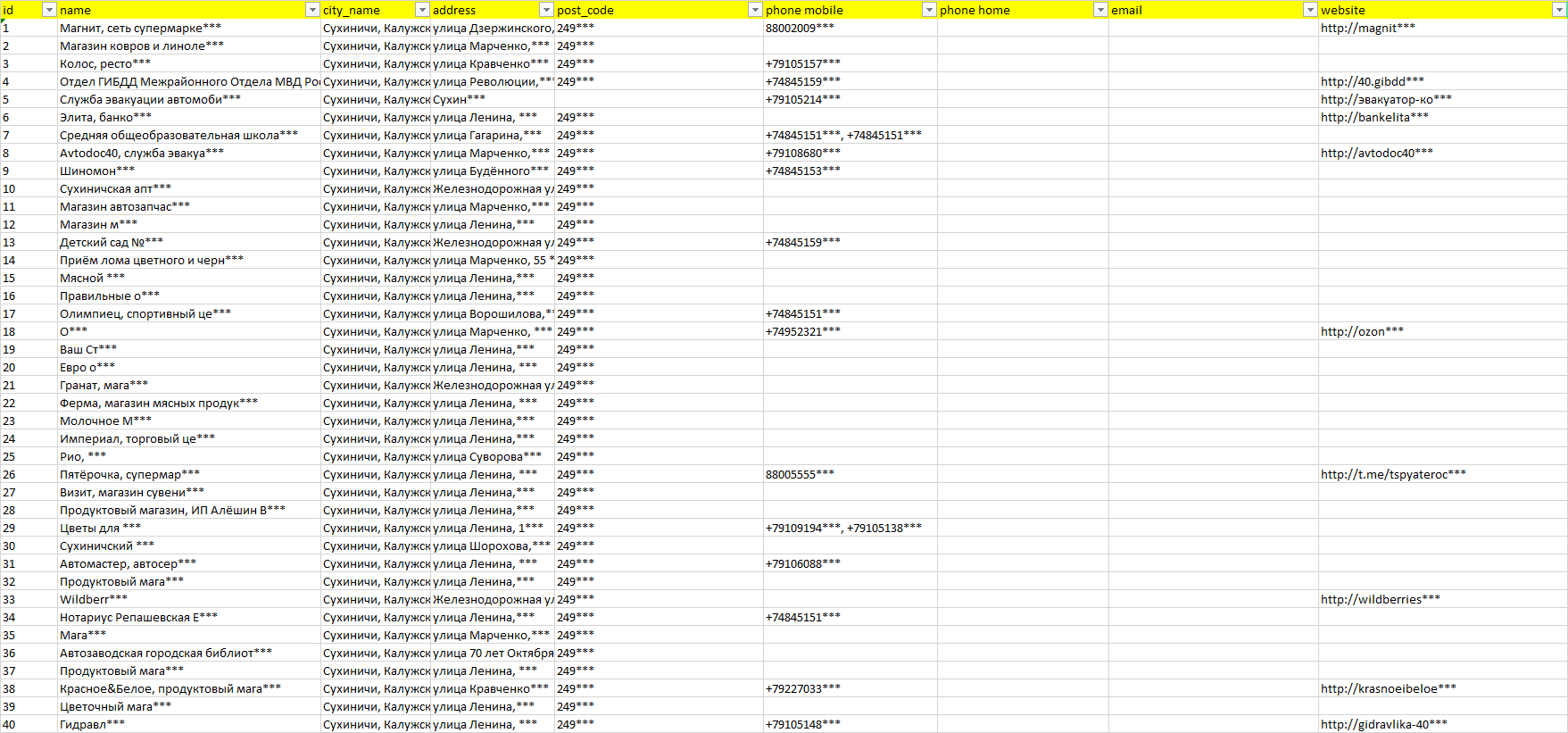 База компаний Сухиничи, вся РФ в формате Excel с эл. почтами, телефонами, сайтами, ссылками на соц сети, координатами и другой информацией. Скачайте демо версию, чтобы ознакомиться с данными.