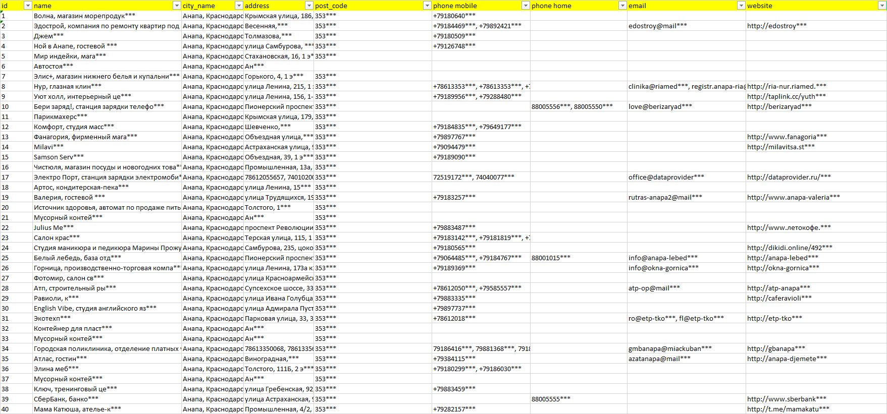 База компаний Анапа, вся РФ в формате Excel с эл. почтами, телефонами, сайтами, ссылками на соц сети, координатами и другой информацией. Скачайте демо версию, чтобы ознакомиться с данными.