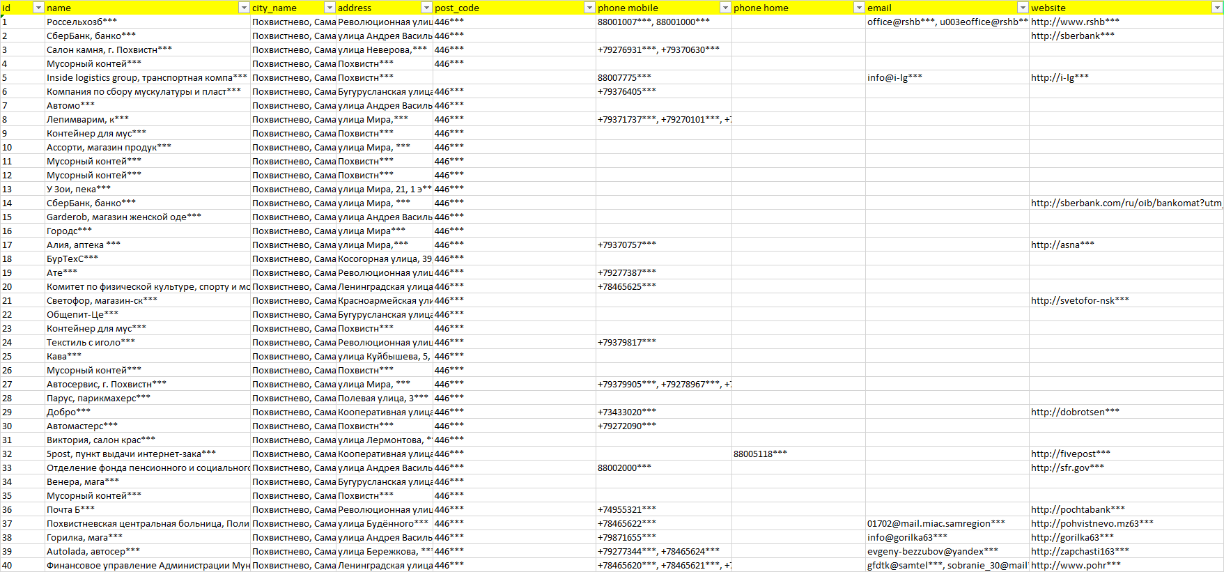 База организаций Похвистнево, вся Россия в формате Excel с эл. почтами, телефонами, сайтами, ссылками на соц сети, координатами и другой информацией. Скачайте демо версию, чтобы ознакомиться с данными.
