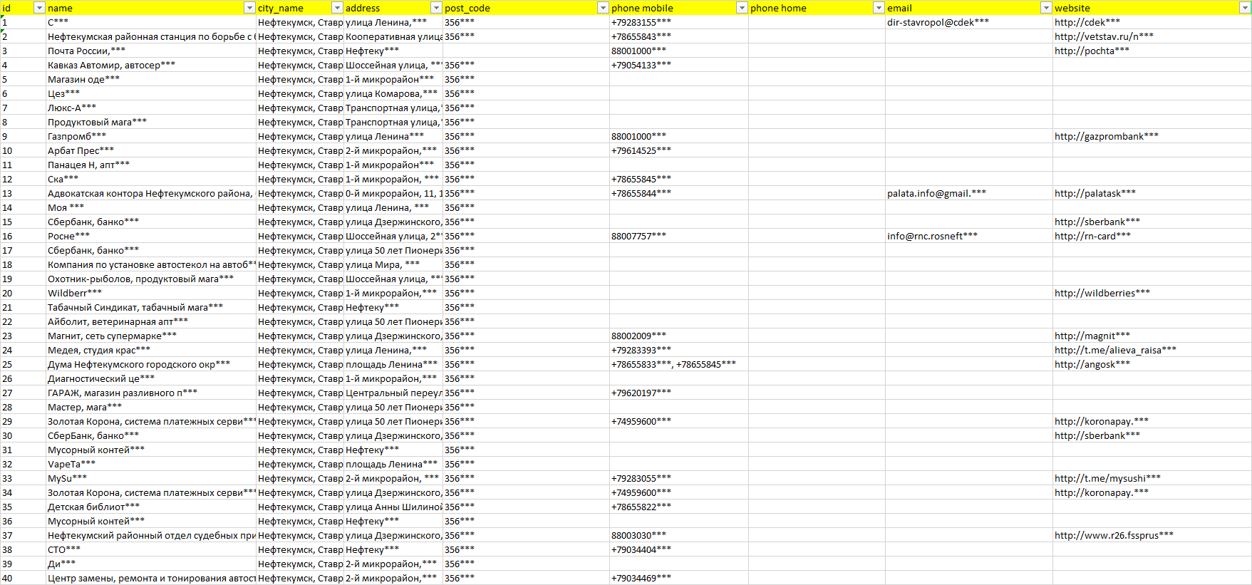 База организаций Нефтекумск, вся Россия в формате Excel с эл. почтами, телефонами, сайтами, ссылками на соц сети, координатами и другой информацией. Скачайте демо версию, чтобы ознакомиться с данными.