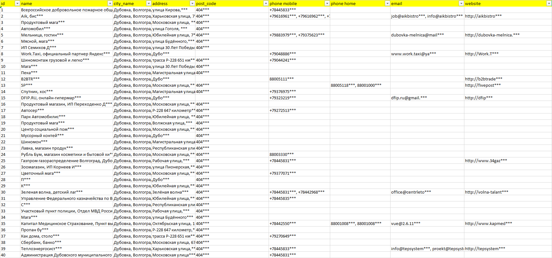 База организаций Дубовка, вся Россия в формате Excel с эл. почтами, телефонами, сайтами, ссылками на соц сети, координатами и другой информацией. Скачайте демо версию, чтобы ознакомиться с данными.