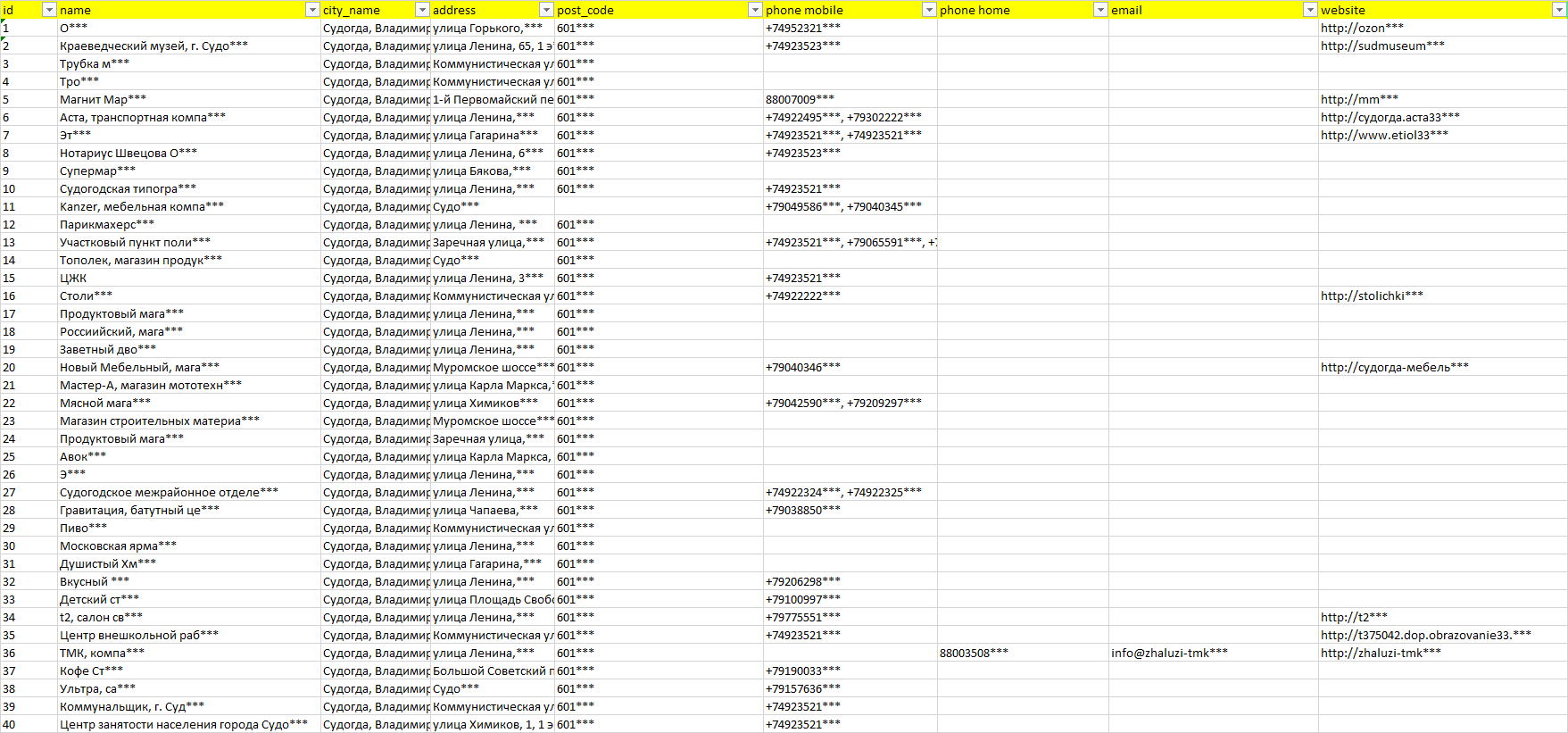 База компаний Судогда, вся РФ в формате Excel с эл. почтами, телефонами, сайтами, ссылками на соц сети, координатами и другой информацией. Скачайте демо версию, чтобы ознакомиться с данными.