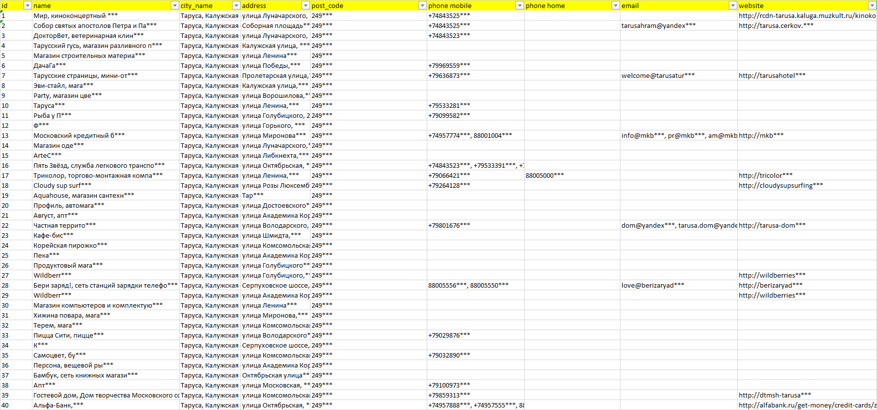 База компаний Таруса, вся РФ в формате Excel с эл. почтами, телефонами, сайтами, ссылками на соц сети, координатами и другой информацией. Скачайте демо версию, чтобы ознакомиться с данными.