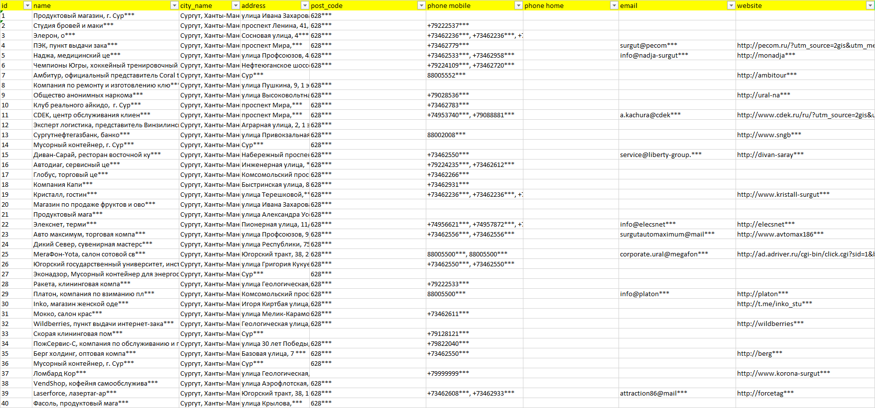 База компаний Сургут, вся РФ в формате Excel с эл. почтами, телефонами, сайтами, ссылками на соц сети, координатами и другой информацией. Скачайте демо версию, чтобы ознакомиться с данными.