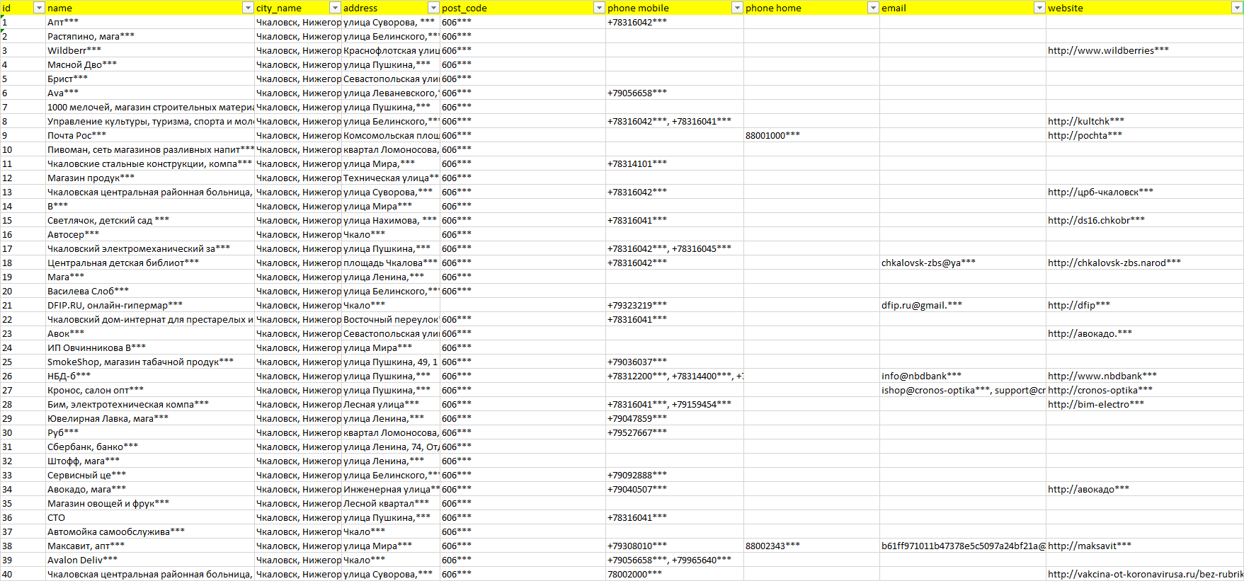 База компаний Чкаловск, вся РФ в формате Excel с эл. почтами, телефонами, сайтами, ссылками на соц сети, координатами и другой информацией. Скачайте демо версию, чтобы ознакомиться с данными.