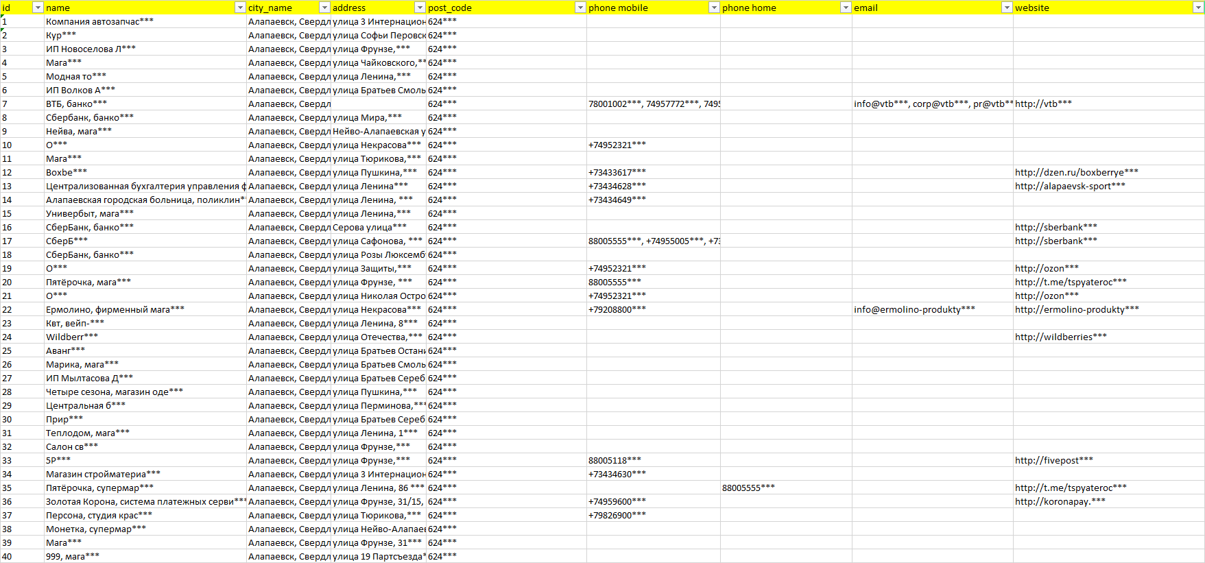 База организаций Алапаевск, вся Россия в формате Excel с эл. почтами, телефонами, сайтами, ссылками на соц сети, координатами и другой информацией. Скачайте демо версию, чтобы ознакомиться с данными.
