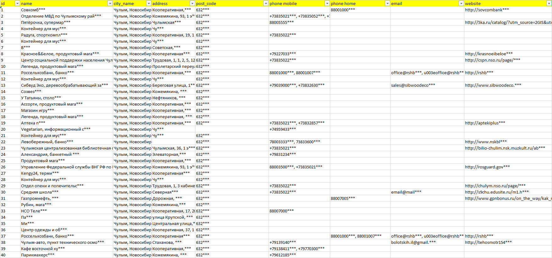 База компаний Чулым, вся РФ в формате Excel с эл. почтами, телефонами, сайтами, ссылками на соц сети, координатами и другой информацией. Скачайте демо версию, чтобы ознакомиться с данными.