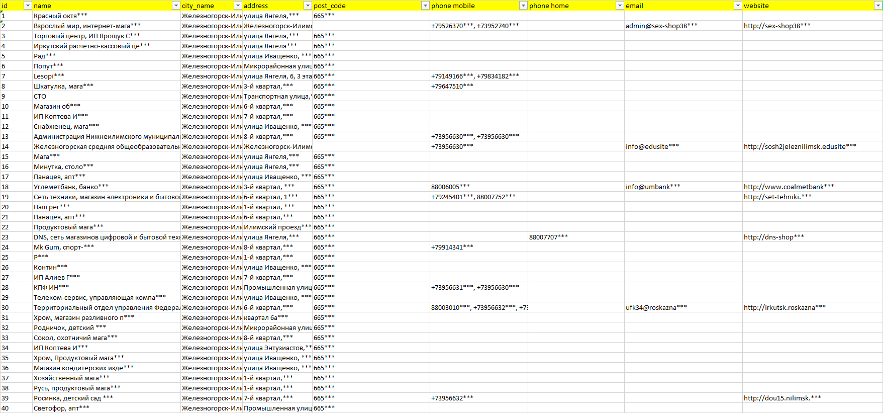 База организаций Железногорск-Илимский, вся Россия в формате Excel с эл. почтами, телефонами, сайтами, ссылками на соц сети, координатами и другой информацией. Скачайте демо версию, чтобы ознакомиться с данными.