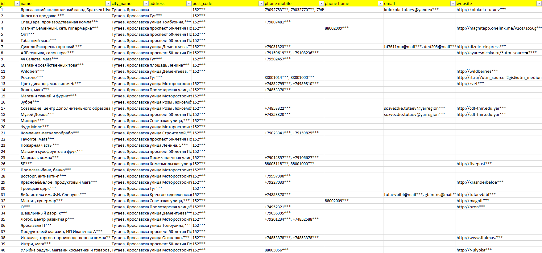 База организаций Тутаев, вся Россия в формате Excel с эл. почтами, телефонами, сайтами, ссылками на соц сети, координатами и другой информацией. Скачайте демо версию, чтобы ознакомиться с данными.