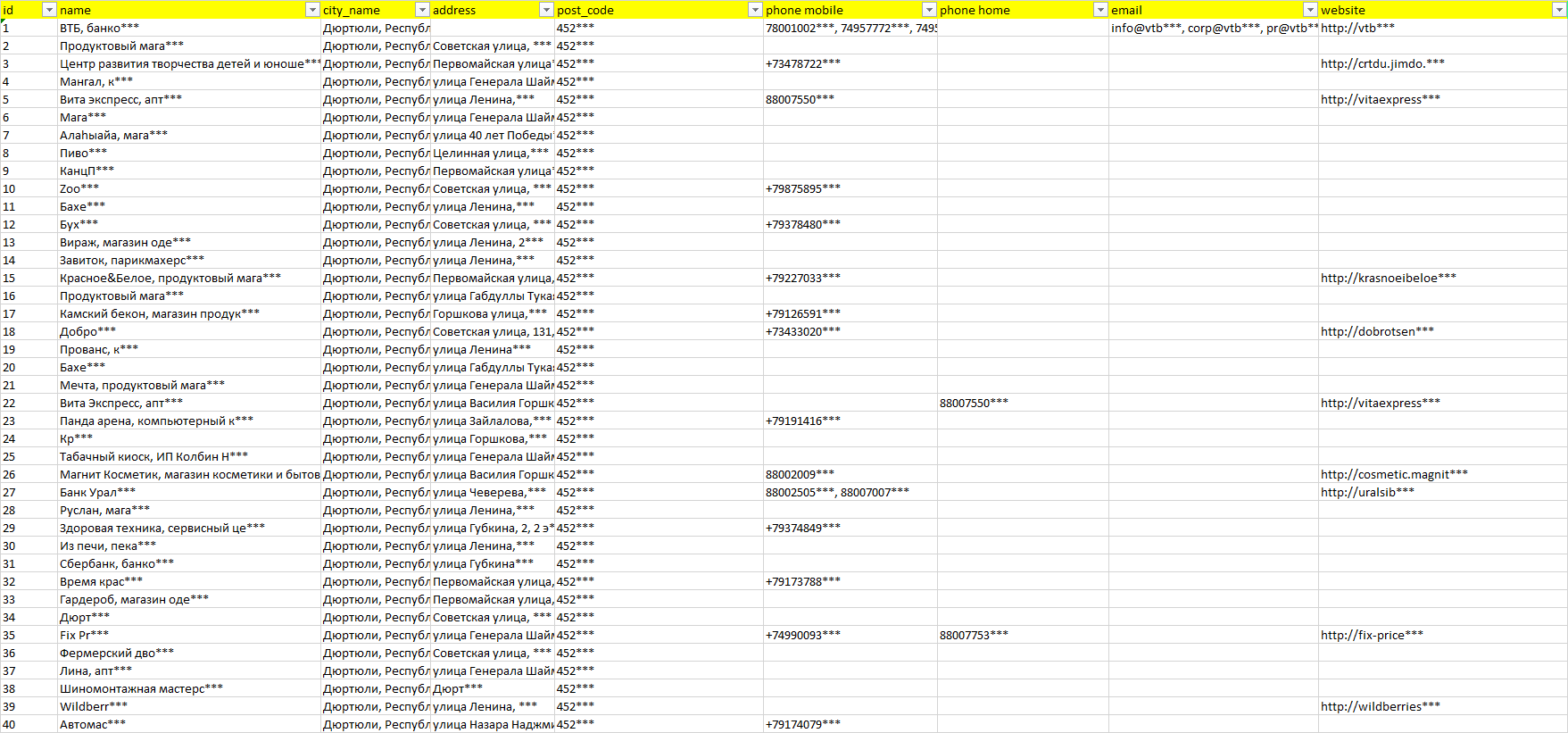 База организаций Дюртюли, вся Россия в формате Excel с эл. почтами, телефонами, сайтами, ссылками на соц сети, координатами и другой информацией. Скачайте демо версию, чтобы ознакомиться с данными.