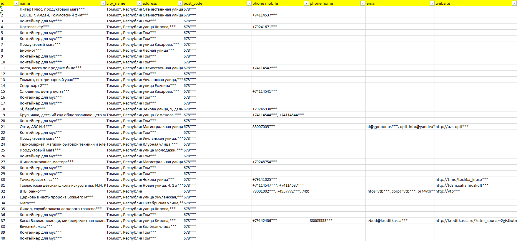 База организаций Томмот, вся Россия в формате Excel с эл. почтами, телефонами, сайтами, ссылками на соц сети, координатами и другой информацией. Скачайте демо версию, чтобы ознакомиться с данными.