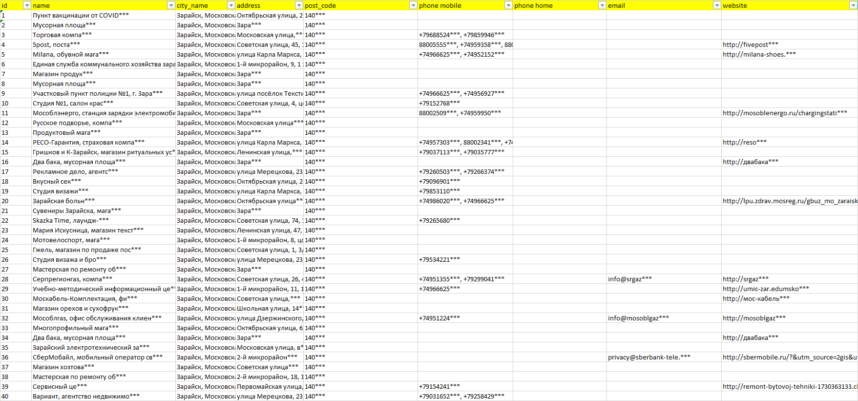 База компаний Зарайск, вся РФ в формате Excel с эл. почтами, телефонами, сайтами, ссылками на соц сети, координатами и другой информацией. Скачайте демо версию, чтобы ознакомиться с данными.