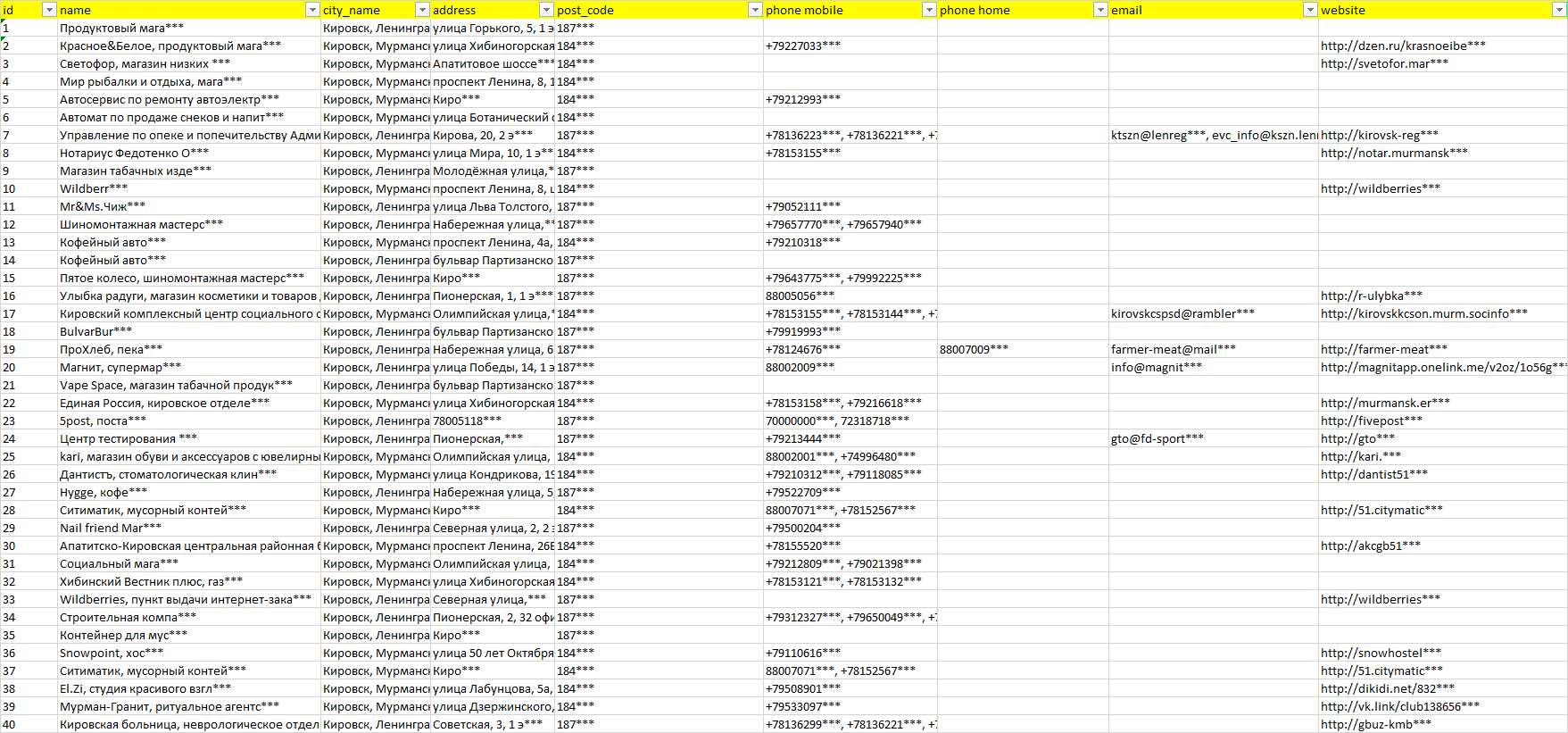 База компаний Кировск, вся РФ в формате Excel с эл. почтами, телефонами, сайтами, ссылками на соц сети, координатами и другой информацией. Скачайте демо версию, чтобы ознакомиться с данными.