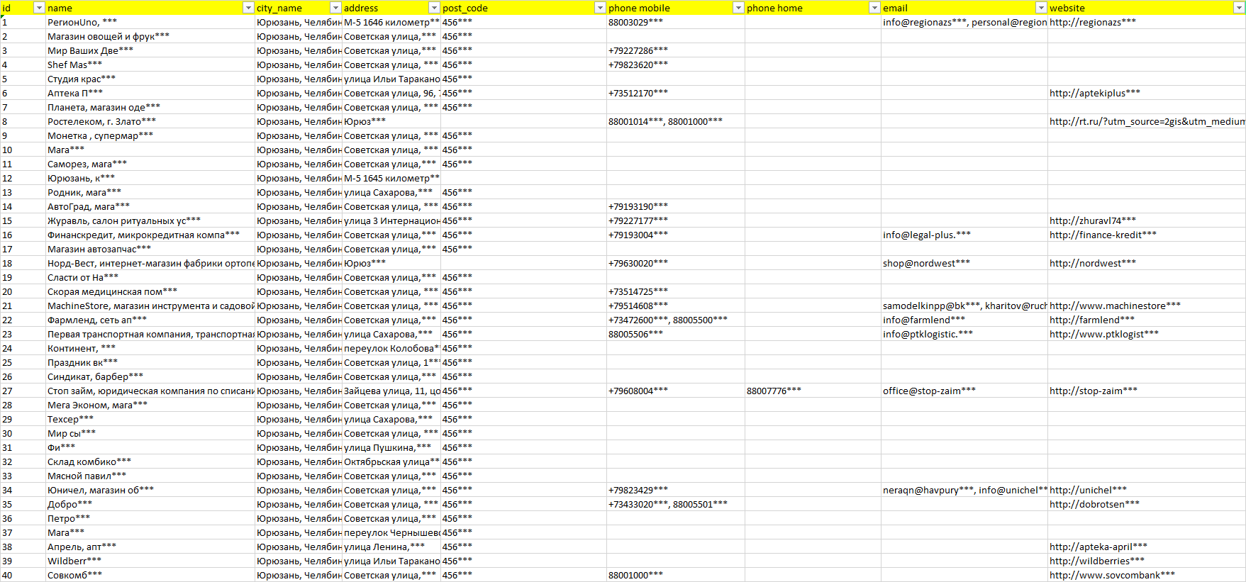 База компаний Юрюзань, вся РФ в формате Excel с эл. почтами, телефонами, сайтами, ссылками на соц сети, координатами и другой информацией. Скачайте демо версию, чтобы ознакомиться с данными.