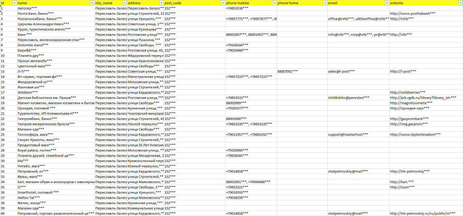 База компаний Переславль-Залесский, вся РФ в формате Excel с эл. почтами, телефонами, сайтами, ссылками на соц сети, координатами и другой информацией. Скачайте демо версию, чтобы ознакомиться с данными.