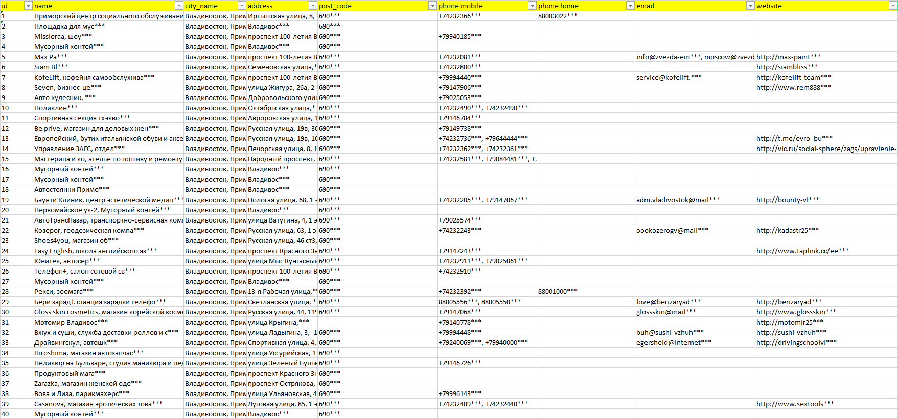 База компаний Владивосток, вся РФ в формате Excel с эл. почтами, телефонами, сайтами, ссылками на соц сети, координатами и другой информацией. Скачайте демо версию, чтобы ознакомиться с данными.
