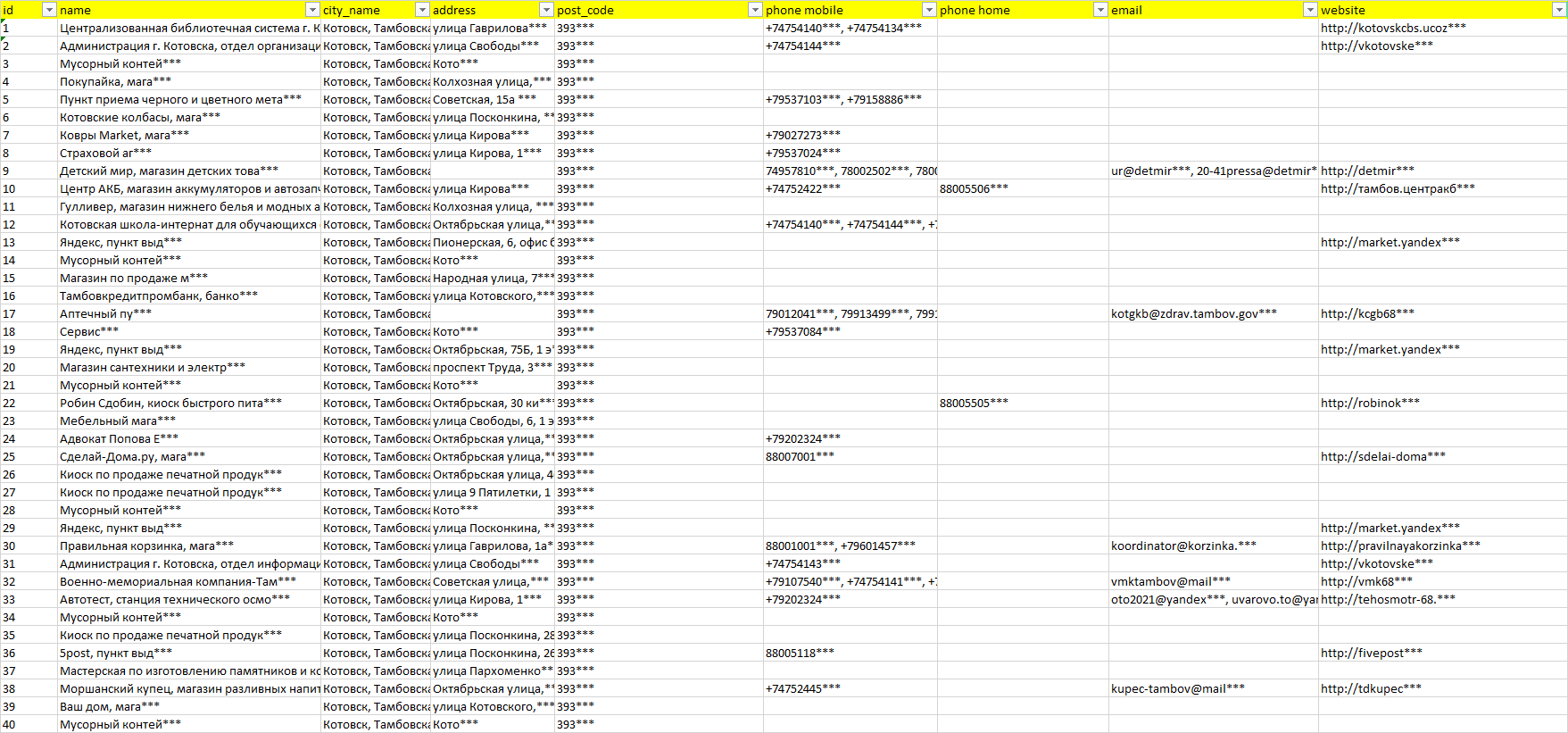 База компаний Котовск, вся РФ в формате Excel с эл. почтами, телефонами, сайтами, ссылками на соц сети, координатами и другой информацией. Скачайте демо версию, чтобы ознакомиться с данными.