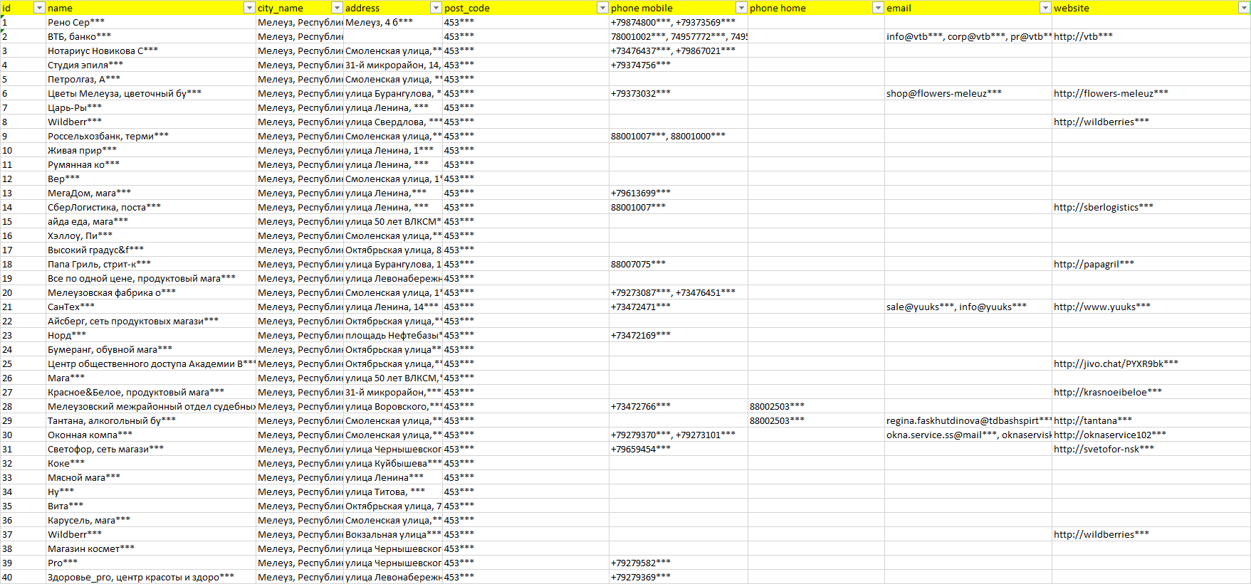 База организаций Мелеуз, вся Россия в формате Excel с эл. почтами, телефонами, сайтами, ссылками на соц сети, координатами и другой информацией. Скачайте демо версию, чтобы ознакомиться с данными.