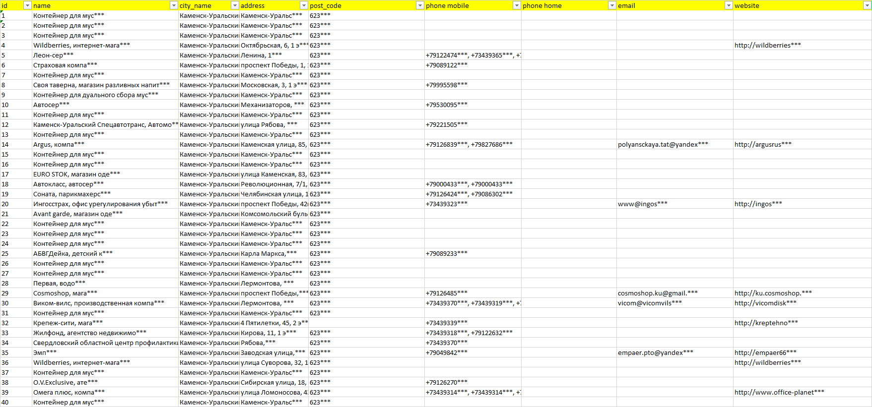 База организаций Каменск-Уральский, вся Россия в формате Excel с эл. почтами, телефонами, сайтами, ссылками на соц сети, координатами и другой информацией. Скачайте демо версию, чтобы ознакомиться с данными.
