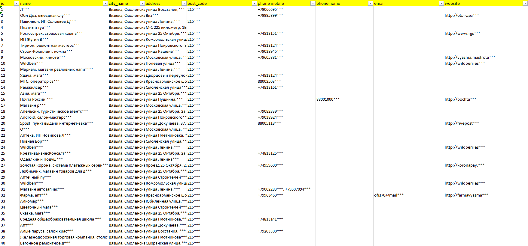 База компаний Вязьма, вся РФ в формате Excel с эл. почтами, телефонами, сайтами, ссылками на соц сети, координатами и другой информацией. Скачайте демо версию, чтобы ознакомиться с данными.
